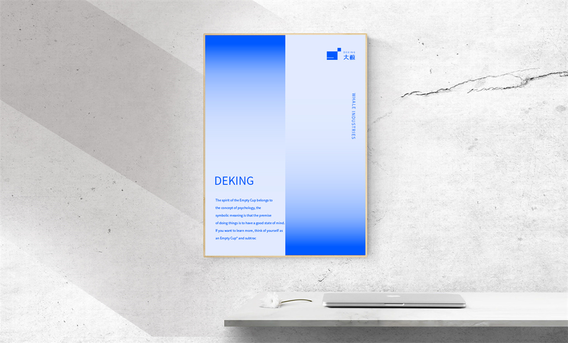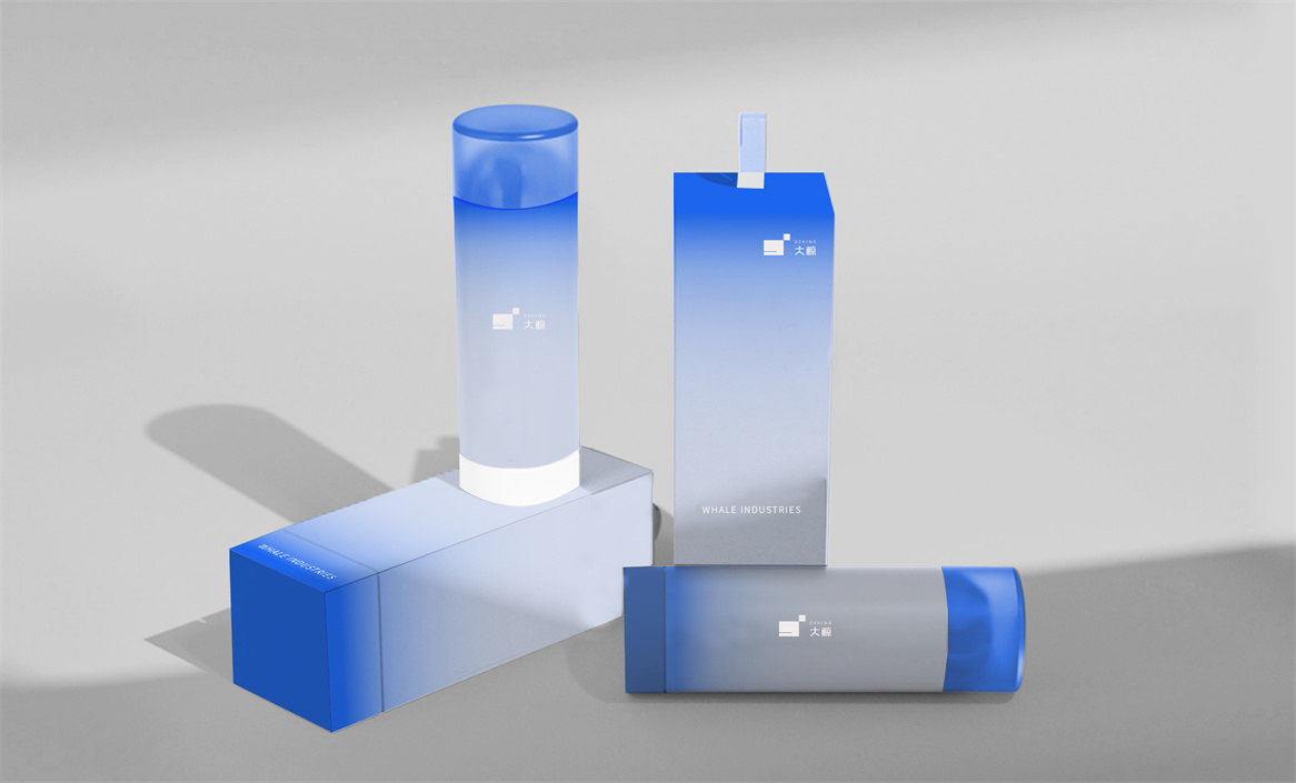 品牌形象設計造“形”易,但鍛“氣”難。大鯨實業企業形象設計由于其品牌指向性比較明顯,所以我們的設計策略思想就是順認知而為,又要跳出常規認知,做到似曾相識而又耳目一新。于是在設計創作時采用了大鯨的形象特征結合空間元素來設計,用幾何化圖形表達一個抽象的品牌概念,用時尚而純粹的海藍色表達企業的氣質與活力。