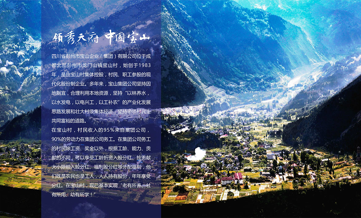 四川寶山企業(集團)有限公司位于成都北部彭州市寶山村,始創于1983年,由寶山村集體控股,村民、職工參股的現代化股份制企業。多年來,寶山企業集團堅持因地制宜、合理利用本地資源,堅持“以林養水,以水發電,以電興工,以工補農”的產業化發展思路發展和壯大集體經濟,形成了集水電開發、礦山開采、林產品加工、旅游開發等為一體的擁有26家企業固定資產達40億元工農業總產值60多億元的綜合性集團化公司。先后榮獲“國家級文明單位’’、“四川省百強企業”、“成都市重點產業化龍頭企業”、“西部山區第一村” 等稱號。