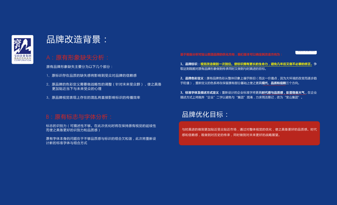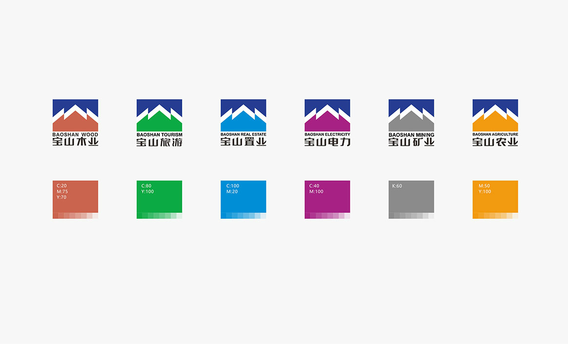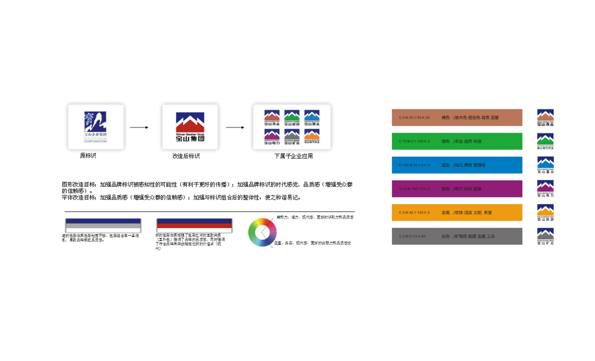 通過對寶山集團和各產業及26家公司實際情況的調研和分析,我們對寶山品牌形象做了詳細的梳理與合理的規劃,既做到了集團形象的傳承與創新,又解決了集團旗下各產業公司形象的統一性和差異化之間的矛盾。依據分析,勤略提出了“領秀天府,中國寶山”的品牌核心理念,傳承并創新性的設計了集團新的形象統一識別系統,又依據各產業的屬性和特征,通過不同的標準色進行差異化區分,既保證了集團形象的統一,又滿足了集團下各產業公司的差異化。
