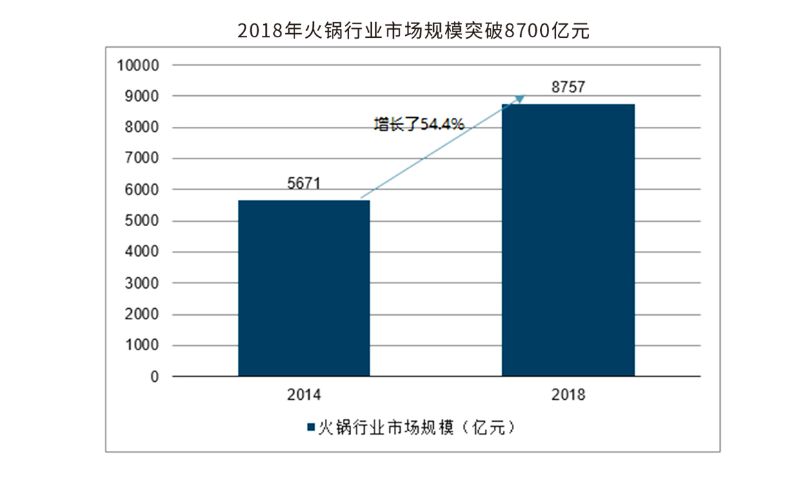 眾所周知,火鍋餐飲是餐飲細分中最大的品類,是餐飲行業的翹楚,2018年,全國火鍋業實現總收入8757億元,占餐飲市場份額的比重達到20.5%,而且火鍋餐飲行業還在持續增高,未來幾年火鍋市場有望迎來萬億市場空間。