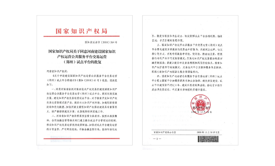 鄭州知識產權交易所暨國家知識產權交易運營公共服務平臺(鄭州)試點平臺是由河南省技術產權交易所承建,全國唯一一個知識產權交易專業市場。在國家知識產權強國戰略的背景下,為了破解知識產權轉移轉化難、評估定價難、專利質押難、交易流動難、投資退出難、風險防控難等問題,由國家知識產權局會同財政部發起,是國家“1+N”知識產權運營體系的核心載體。旨在推動知識產權轉移轉化,引領和支撐企業發展、產業升級、經濟轉型和效益提升。