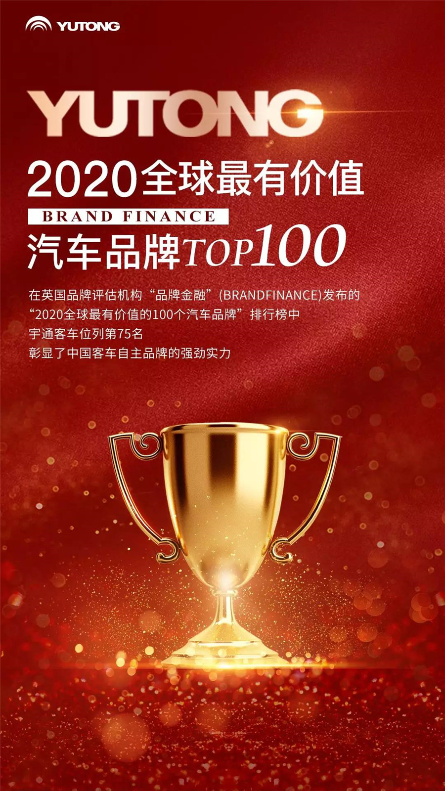 日前,英國品牌評估機構“品牌金融”(Brand Finance)發布“2020全球最有價值的100個汽車品牌”排行榜(Automobiles 100 2020),宇通客車位列第75名,與奔馳、寶馬等汽車行業標桿品牌共同上榜。