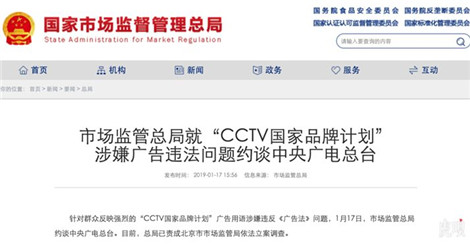 2019年1月17日,國家市場監督管理總局針對“CCTV國家品牌計劃”廣告用語涉嫌違反《廣告法》問題約談中央廣電總臺,并責成北京市市場監管局依法立案調查。