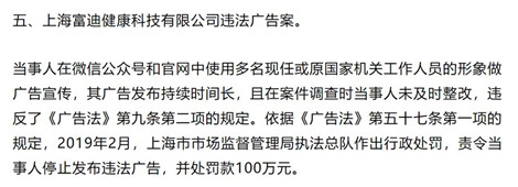 2019年,上海富迪健康科技有限公司因使用多名國家機關工作人員的形象做廣告宣傳,被罰款100萬元。