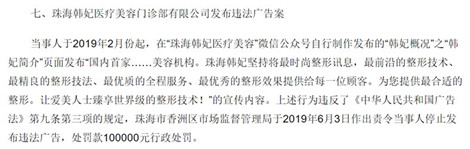 2019年,珠海韓妃醫療美容門診部有限公司發布包含“國內首家”、“最前沿的整形技術、最精良的整形技法、最優秀的整形效果”、“世界級的整形技術”的宣傳內容,被罰款10萬元。