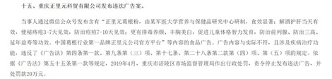 2019年11月,重慶正里元科貿有限公司發布含有“中國葛根行業第一品牌”等內容的食品廣告,被罰款20萬元。