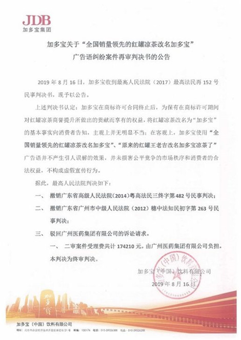 2019年8月16日,根據最高院《民事判決書》,判決武漢加多寶賠償廣藥集團、王老吉大健康共計100萬元,并停止發布包含“中國每賣10罐涼茶7罐加多寶”廣告詞,停止使用并銷毀印有“全國銷量領先的紅罐涼茶——加多寶”廣告詞的產品包裝。