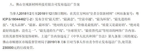 2019年,佛山皇域新材料科技有限公司發布含有 “龍頭品牌”、“絕對的無污染”、“價格是最低的”、“質量又是最好的”、“絕對是最好的選擇,沒有之一”、“全球頂尖”、“最佳替代品”等用語的廣告,被罰款23萬元。