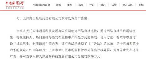 2018年6月15日,上海海王星辰藥房有限公司因開展“有球必硬夜夜激情”網絡直播活動,被依法處罰款70萬元。