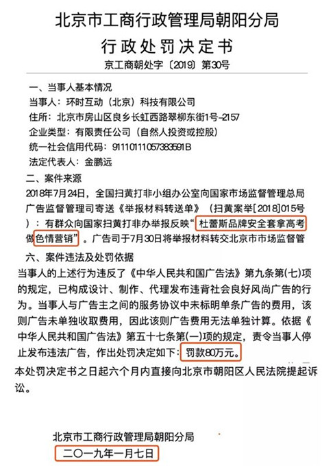 2018年7月24日,環時互動因為杜蕾斯品牌做高考軟色情營銷,被罰款80萬元。