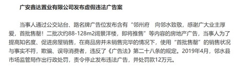 2019年10月,四川廣安鑫達置業有限公司因發布的廣告中包含“首批售罄”字樣,被罰款12萬元。