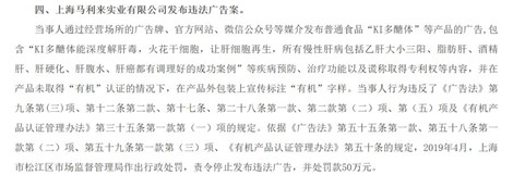 2019年12月,上海馬利來實業有限公司因虛假宣傳普通食品“KI多醣體”具有疾病預防、治療功能的廣告,被罰款50萬元。