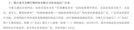 2019年,浙江嘉興圣洲生物科技有限公司因發布涉及疾病治療功能、使用醫療用語的普通食品廣告“巴西蘑菇”,被罰款7.5萬元。