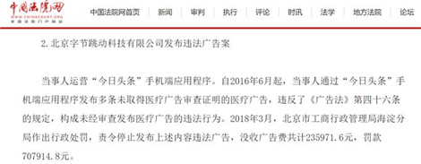 2018年3月,今日頭條APP因發布多條未取得醫療廣告審查證明的醫療廣告,被沒收廣告費23萬余元,并罰款70.79萬元。