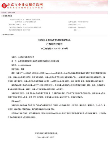 2016年1月25日,小米公司在官網出現“小米4C手機邊緣觸控已申請46項專利的”文字宣傳,但其實專利沒拿到,被處以3萬元罰款。