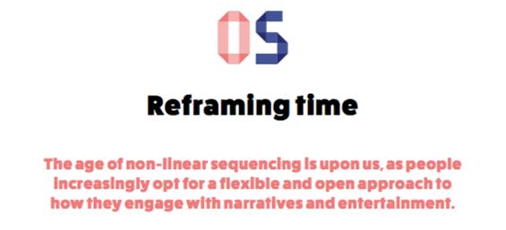24/7/365,現(xiàn)代生活讓我們的“時(shí)間感”越來越無序。想想我們的直播,以及我們消費(fèi)電視、娛樂節(jié)目以及視頻內(nèi)容的方式。技術(shù)讓我們可以“掌控”自己的時(shí)間,但是其實(shí)我們的時(shí)間是被算法掌控了。