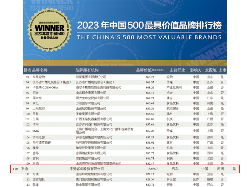 6月15日,由世界品牌實驗室(World Brand Lab)主辦的(第二十屆)“世界品牌大會”在北京如期舉行,2023年《中國500最具價值品牌》分析報告重磅出爐,宇通以829.07億元的品牌價值再度榮耀上榜,位居2023年度最具價值品牌榜第110位,較上年排名上升一位,為中國品牌高質量發展樹立新的典范與標桿。