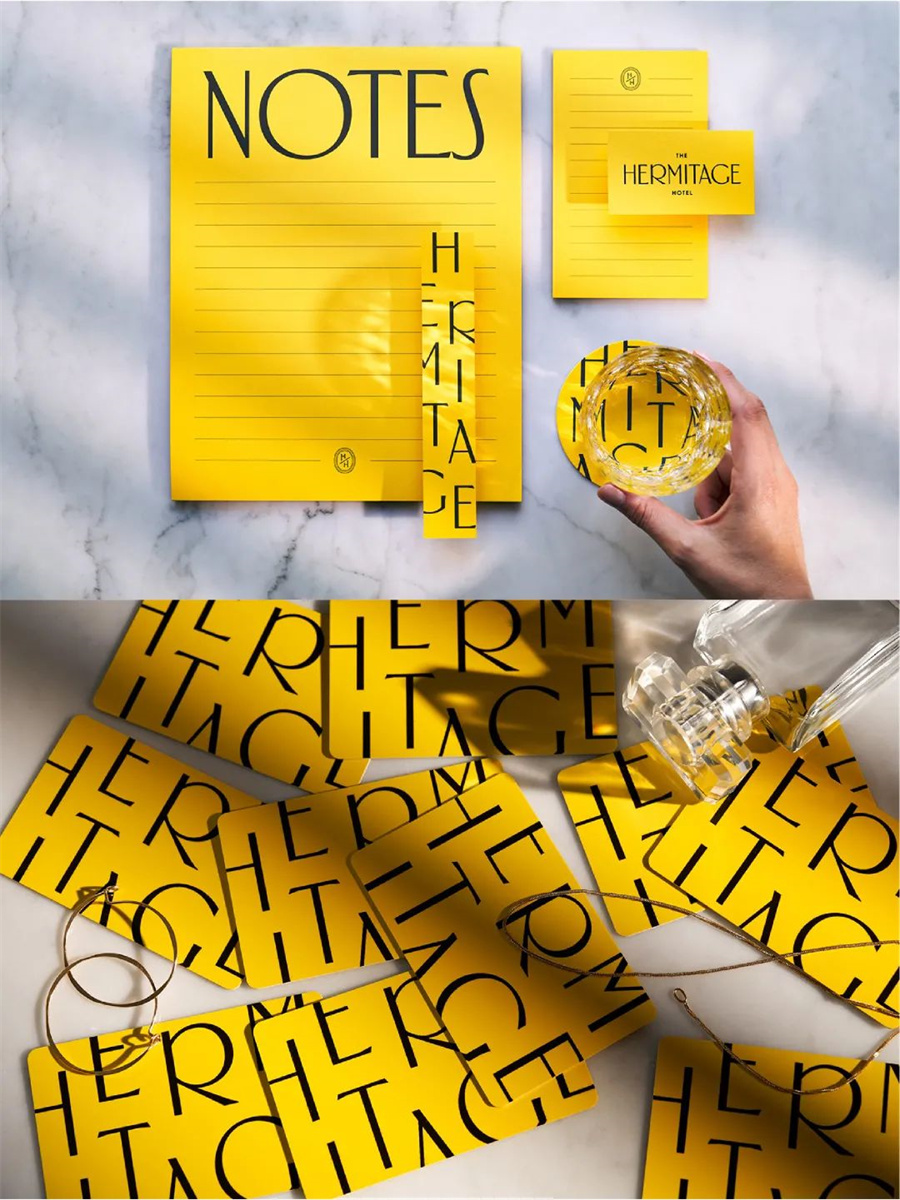 The Hermitage Hotel酒店品牌VI設計以大膽的黃色為主色調,襯托出酒店復古的氣質,“旅行的目的地不是一個地方,而是一個新觀點”,設計師秉承著這樣的觀點為此設計,打破常規酒店設計,那些探索世界各地欲望與沖動的旅客,會被這家擁有極具設計特色的酒店所吸引。
