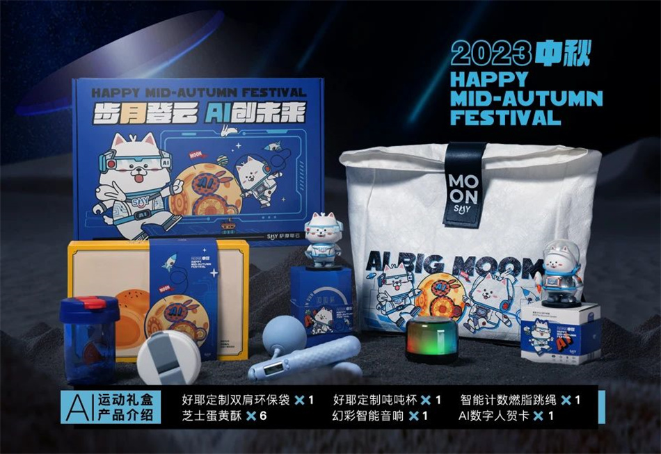 此外,中秋禮盒AI運(yùn)動科技風(fēng)的選品也極為用心:包含IP定制的雙肩包與噸噸杯、幻彩智能音響、智能計數(shù)燃脂跳繩、芝士蛋黃酥以及AI數(shù)字人賀卡。