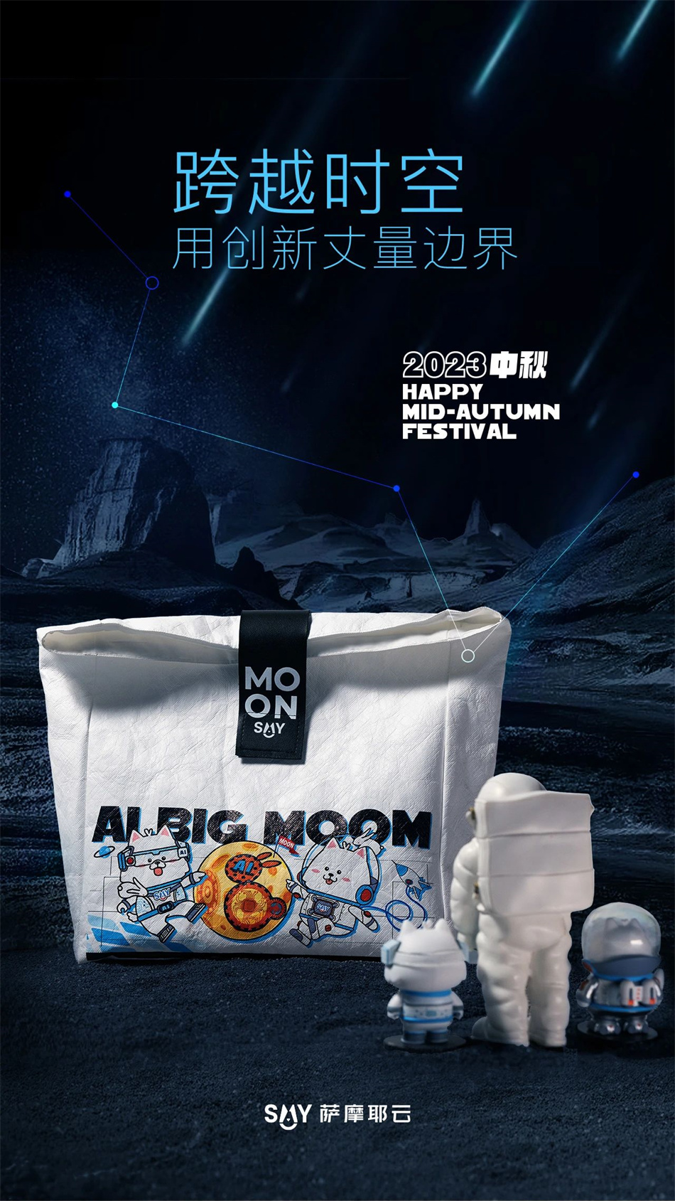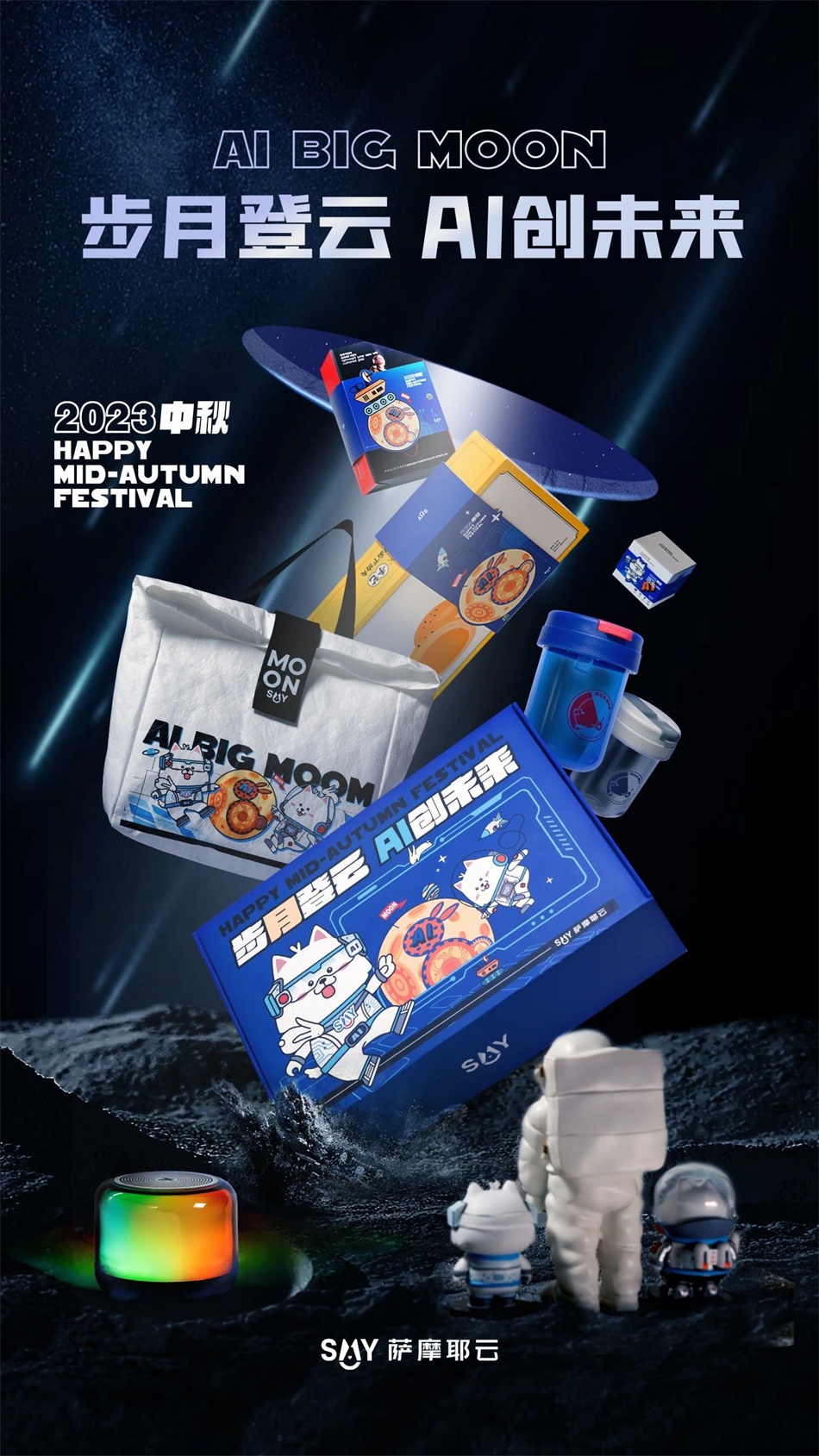 薩摩耶云科技集團(tuán)2023中秋AI科技禮盒包裝設(shè)計,以“步月登云,AI創(chuàng)未來”為設(shè)計主題,體現(xiàn)了滿滿的互聯(lián)網(wǎng)感,彰顯集團(tuán)科技屬性。