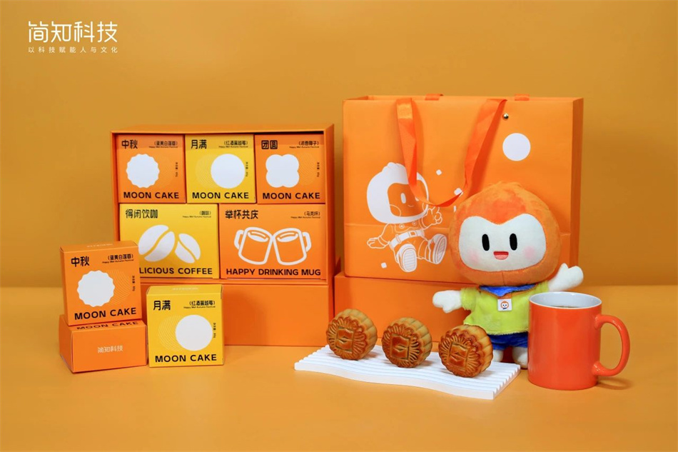 簡知科技2023年的中秋禮盒包裝設(shè)計的主題是月光寶盒,活潑可愛的簡知科技吉祥物在畫中嬉戲,橙黃撞色的月光寶盒,在澄澈月光下,相映成趣,傳遞“橙心橙意”的美好寓意。