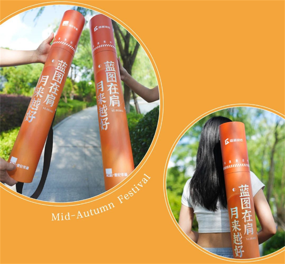 世紀華通集團2023年的中秋禮盒包裝設計以藍圖在肩、月來越好為主題,中秋禮盒與傳統的禮盒不同,采用了圓筒的設計。2023年中秋禮盒內含董事長祝福小冊子*1、驚喜扭扭蛋*6(內含4個月餅、1個酒杯、1份桂花茶)、朱頂紅種子*1。