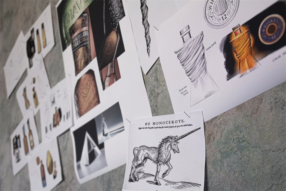 對于這個標簽,我們選擇了艾利丹尼森(Avery Dennison)的天鵝絨靛藍(Velvet Indigo),它給人一種柔軟的感覺,就像獨角獸的感覺,與埃斯塔爾(Estal)制造的堅硬的玻璃角形成鮮明對比。我們沒有在標簽上打印墨水,而是選擇了6種不同的熱箔,從KURZ,來箔標簽,這是一個很大的挑戰,如果沒有Reynders標簽印刷的幫助,我們在這個項目中的印刷合作伙伴是不可能完成的。