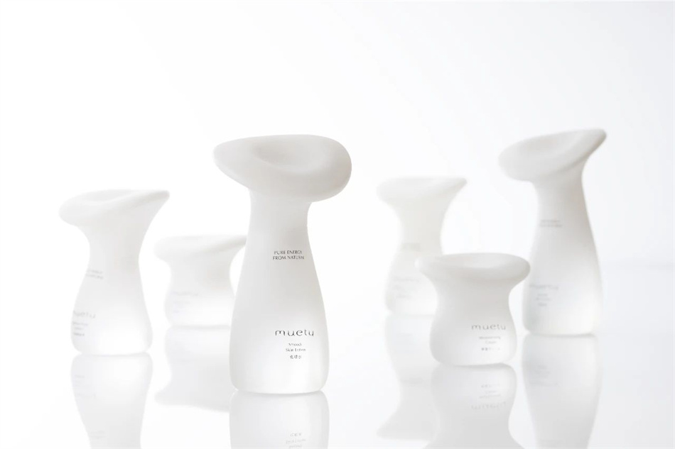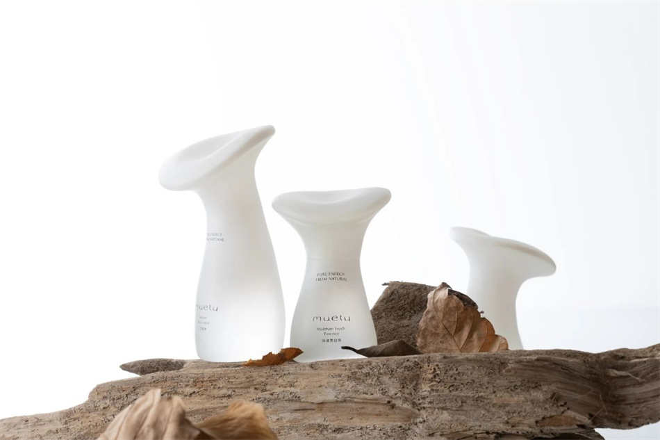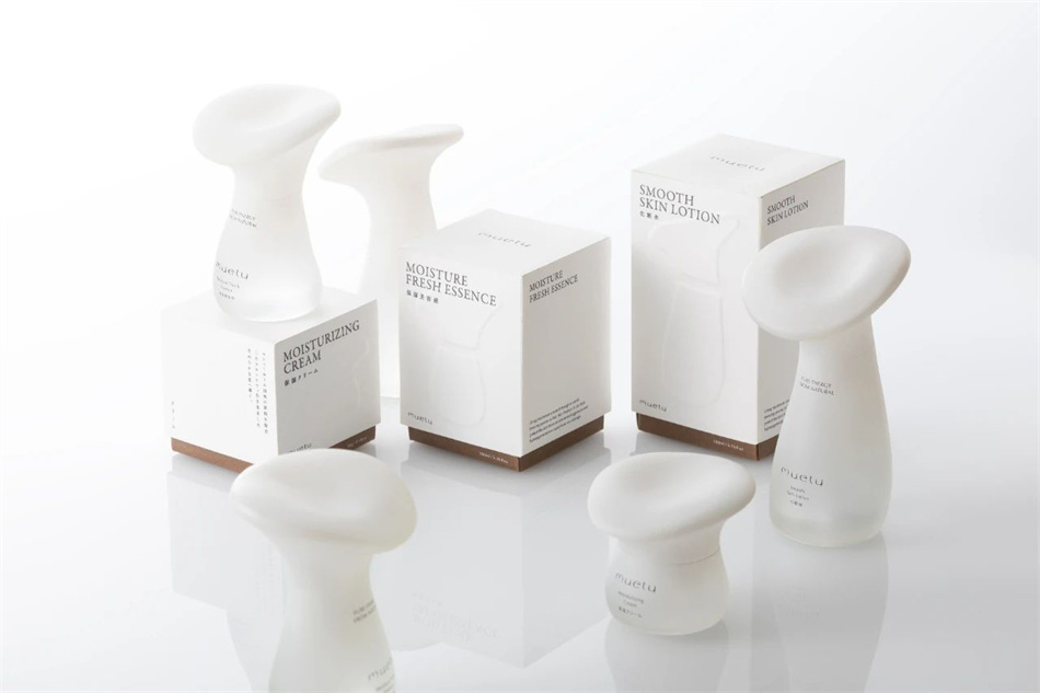 朱赟現任日本P.K.G TOKYO設計事務所的設計師,他在桑澤設計研究所(Kuwasawa Design School)的畢業作品是護膚品品牌“Muety”的包裝設計。這款產品以“煥活美容”為主題,設計靈感源自朱赟從小對蘑菇產生的濃厚興趣。他認為蘑菇的曲線獨特、隨機、充滿生機,而且蘑菇可以在美容、護膚和環保領域發揮作用。于是,他設計了一款以蘑菇成分為主要賣點的護膚產品,并將品牌命名為“Muety”(蘑菇+美容)。“Muety”的瓶身采用了白色漸變設計,給人干凈透明的感覺。