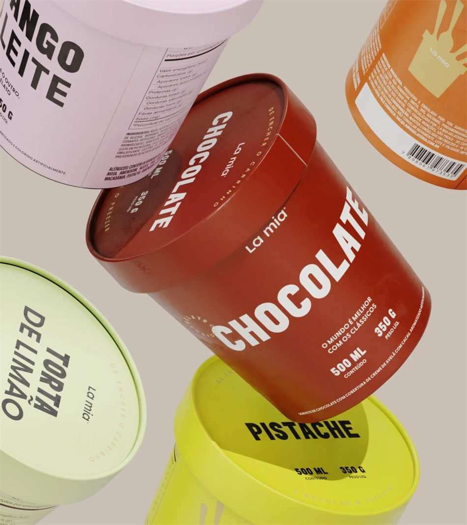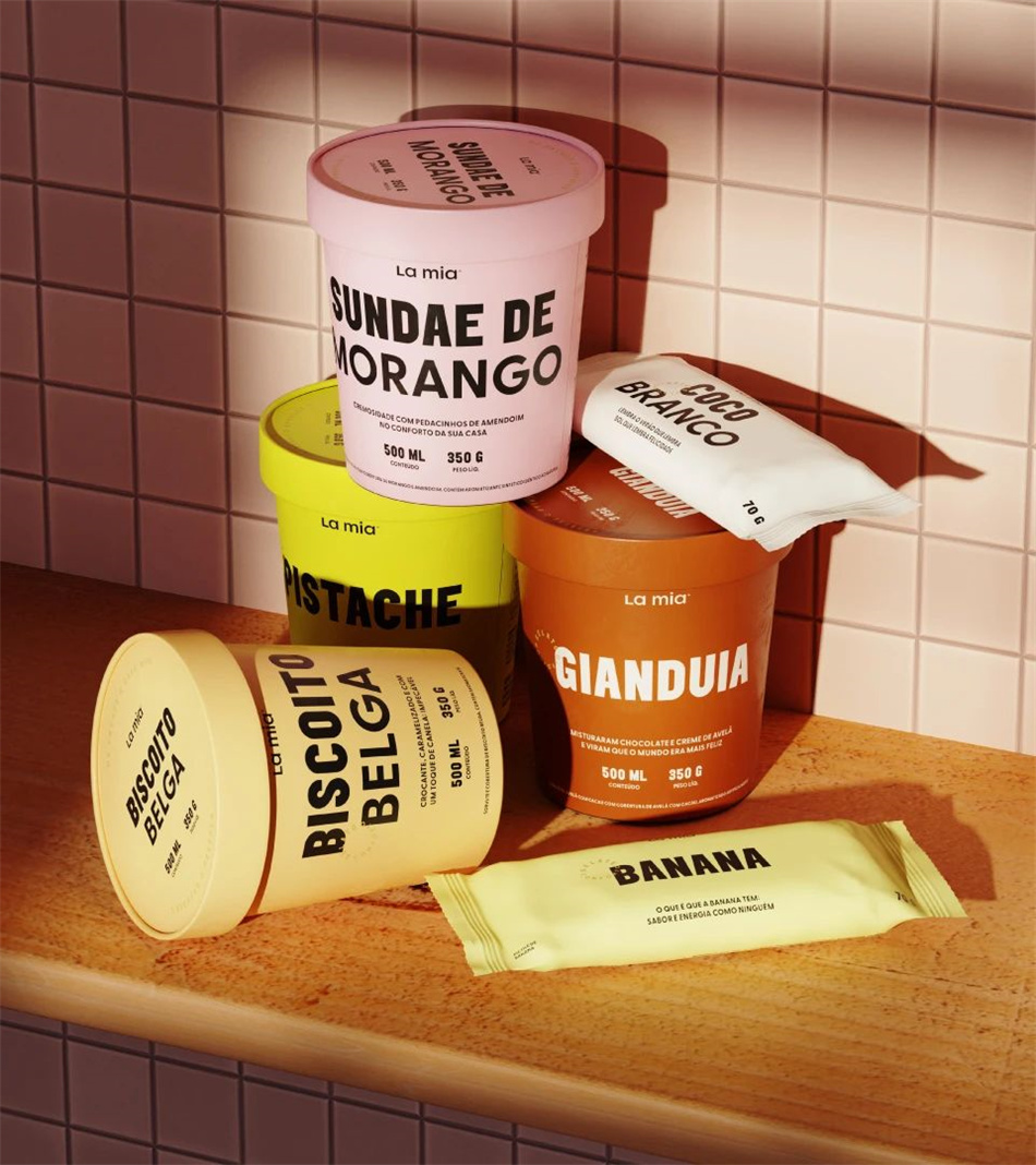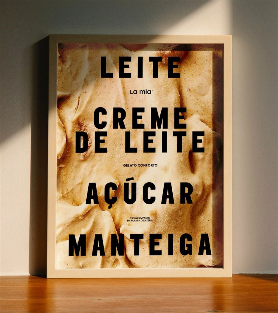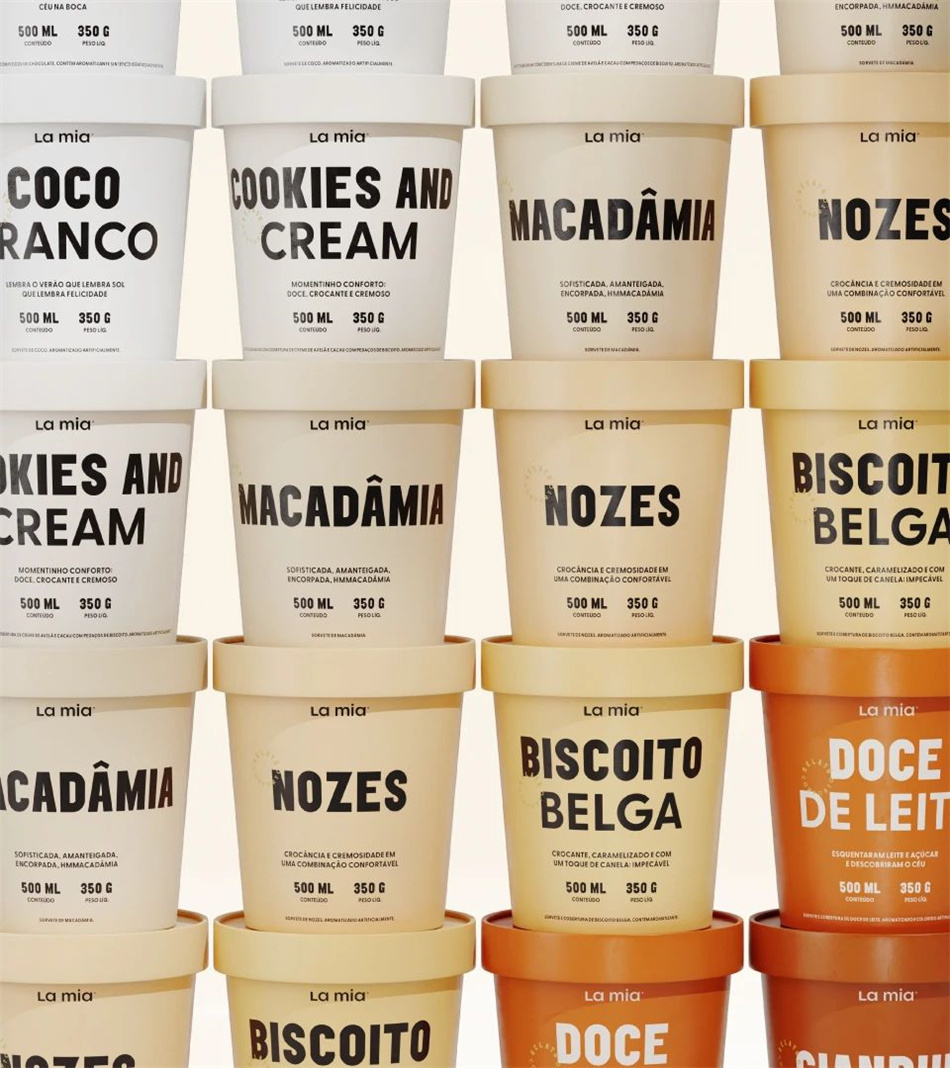 在定位方面,必須傳達諸如價格的可及性、體驗的復雜性以及適合家庭消費的屬性。簡單而感性的標語:“Gelato Conforto (意大利冰淇淋)”。從這個中心信息中,呈現一個輕松幽默的口頭標識,在不同的口味之間帶來愉悅,并在所有渠道和50多個冰淇淋包裝設計中創造舒適的對話。在定義了品牌故事之后,他們創造了一個簡單而輕盈的文字標志,反映了La Mia的純粹本質。對于視覺識別系統設計,除了與每種口味相關的廣泛色彩系統和令人驚訝的排版設計組合外,工作室還創作了一系列容器和冰棒在精致構圖中相互作用的插圖。它在包裝設計、海報設計、社交媒體和制服上的使用給品牌帶來了獨特而有趣的存在。La Mia強調其熱情的個性,已經具有魅力和獨特,準備贏得冰淇淋愛好者的心和舒適的時刻。