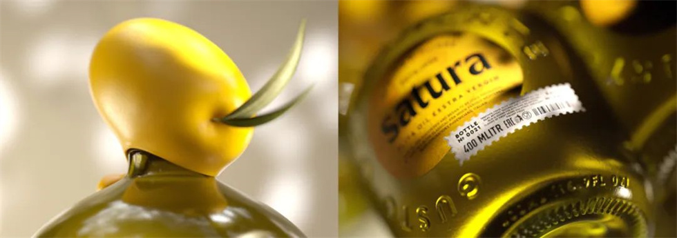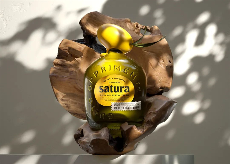 這是一款名為Satura的特別初榨橄欖油,配以獨特的黃色玻璃瓶包裝設計,捕捉了橄欖的精華。瓶蓋采用了一個幻想的包裝造型,類似于一個長滿綠葉的橄欖。瓶蓋為整體瓶身設計增添了一絲自然和清新的氣息,使其在眾多橄欖油中脫穎而出。