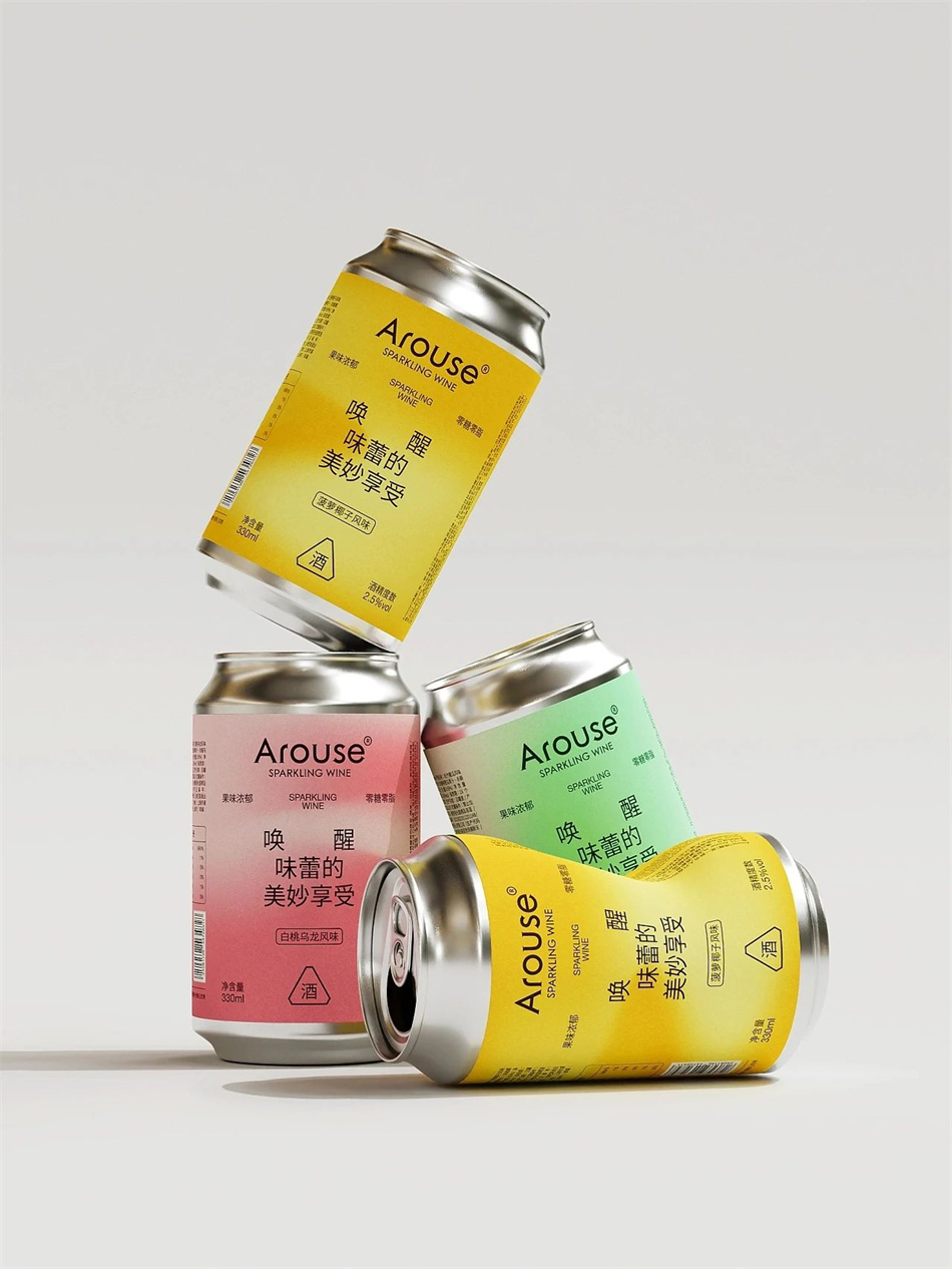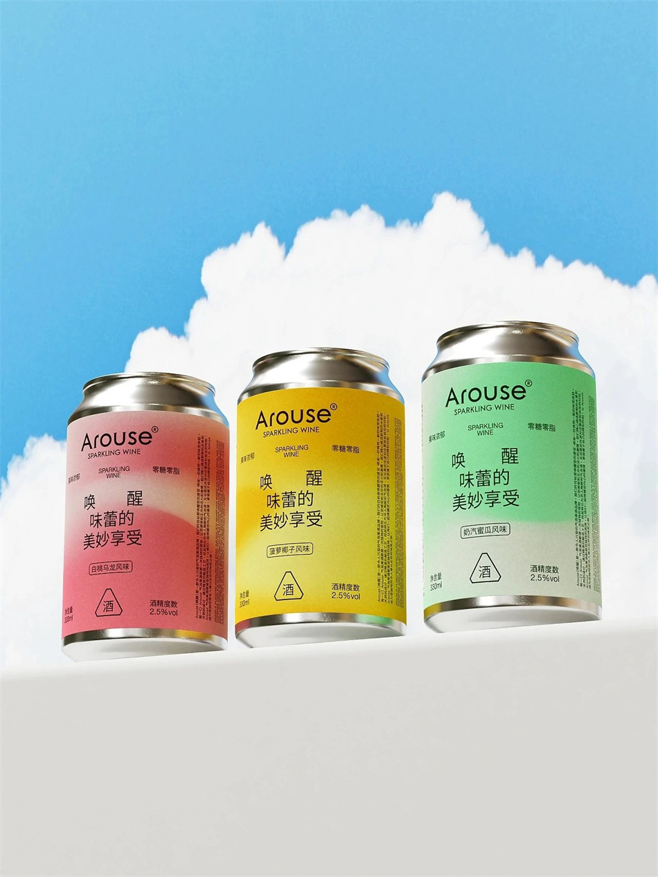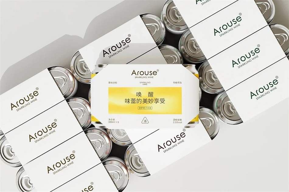 氣泡酒包裝設計版面布局則以簡潔的純文字編排為主,重點突出品牌名和slogan,讓顧客更直觀地感受到Arouse獨特的品牌魅力和時尚個性。