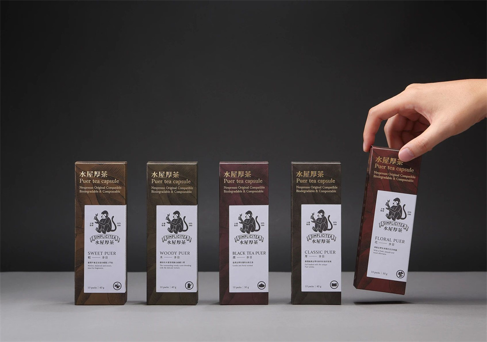 水屋厚茶茶系列包裝設(shè)計(jì)共五種使用赤牛皮紙印上五種顏色區(qū)分口味,繪制普洱茶樹圖騰為背景,將品牌名使用燙金突顯出來,模造紙貼紙?jiān)黾影b層次感,整體包裝設(shè)計(jì)風(fēng)格表現(xiàn)出人文感,及喝茶的歷史。