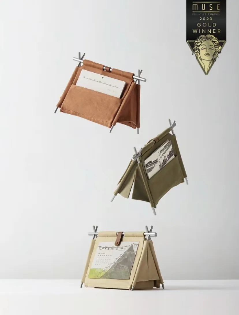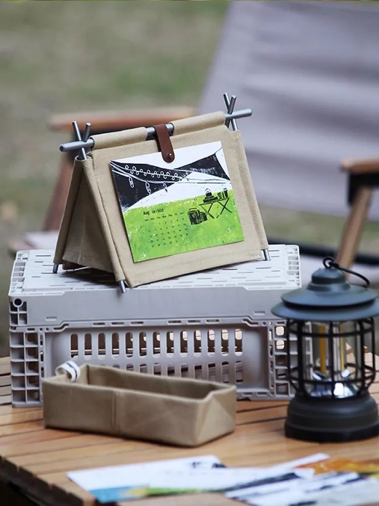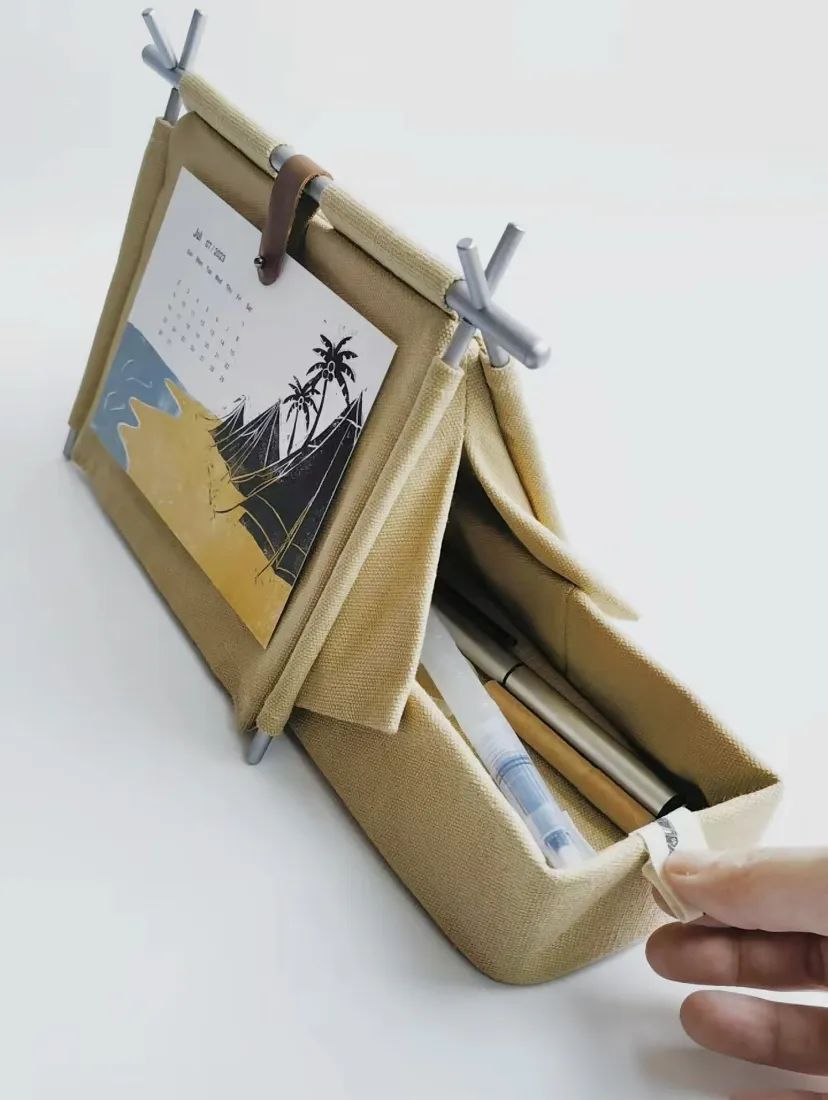 可以自己DIY,金屬支架撐起來就變成一個小帳篷。底部藏了個收納袋,平時可以放放筆、回形針、膠帶等桌面辦公小物件。12張戶外風景畫日歷設計,取用當月的,剩余月份可以收納在“小背袋”里。