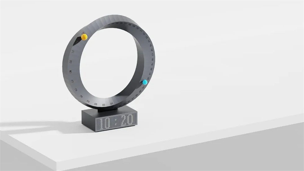 使用兩個(gè)浮動(dòng)彈珠來報(bào)時(shí),黃色代表太陽,指向一個(gè)月;藍(lán)色象征地球,指向每一天。隨著時(shí)間的推移,撥動(dòng)彈珠,可以永遠(yuǎn)“繞”著莫比烏斯環(huán)軌道運(yùn)行。