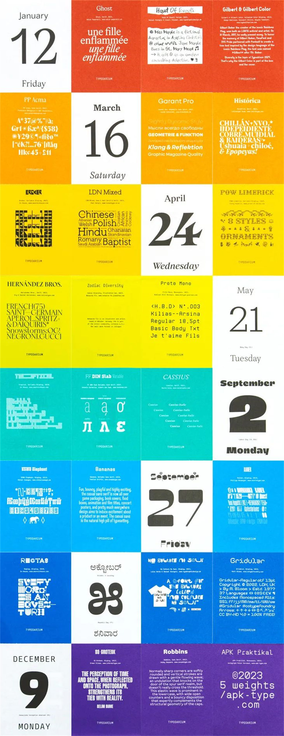 在Typodarium字體日歷設(shè)計上,大家可以看到各種最新的年度字體,有等寬字體、極窄的梵文字體、美術(shù)體、可變字體以及各種雜錦字型,沒有設(shè)計師會拒絕這樣一本日歷。只需要一年的時間,就能學(xué)到366款字體!