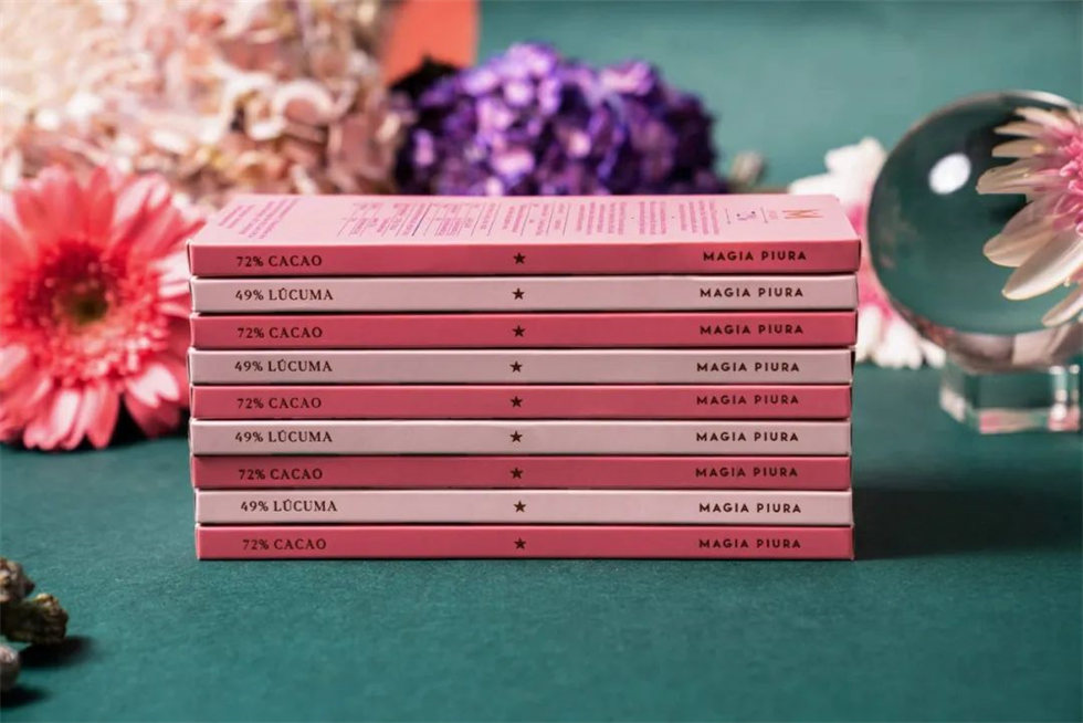 Magia Piura 已經以其獨特的葉形巧克力棒在市場上留下了自己的印記,小鳥、樹葉與水果圖案繪畫得精致細膩、文雅清秀。幾何和不對稱的形狀、慶祝當地生物多樣性的原色和強化神秘主義概念的圖形元素賦予了這種葉形巧克力包裝設計生命。牛奶巧克力迷你葉子采用粉色和藍色粉彩,而半苦迷你葉子則使用更大膽的包裝設計顏色。