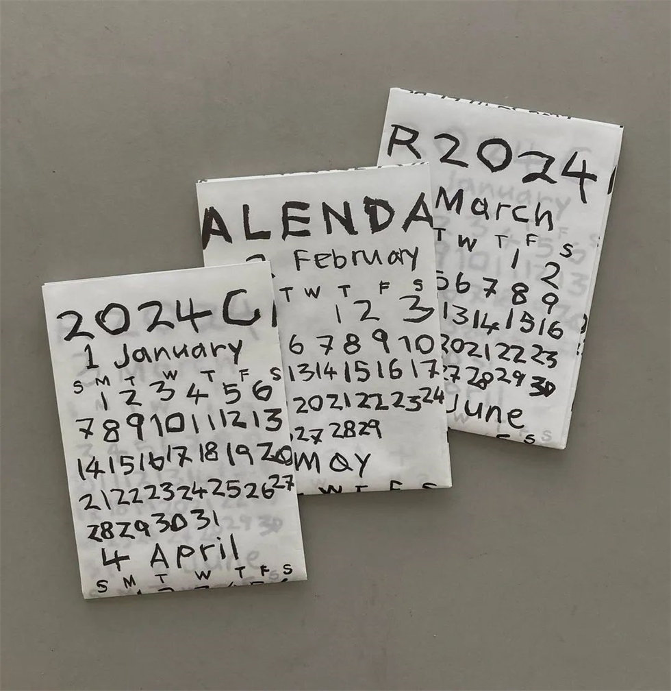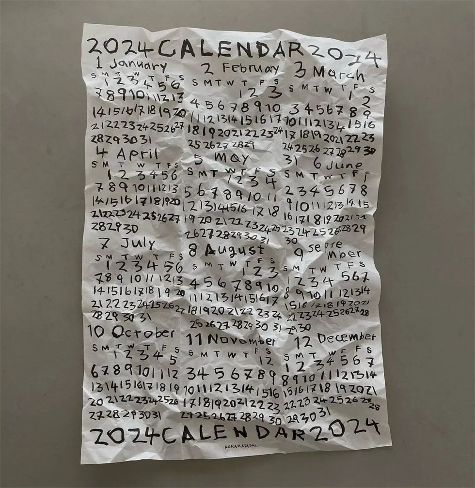 連續幾年,畫家、插畫師林青那(Aona Hayashi)都以隨性的手寫海報的形式繪制2024年歷設計。采用較薄的紙張,能夠輕易折疊、留痕。隨著時間流逝,紙張的褶皺就像是歲月留下來的痕跡。
