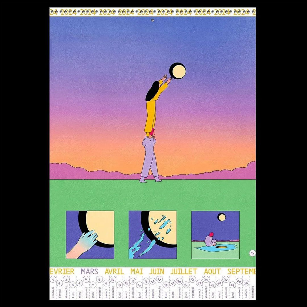 來自巴黎的Riso出版社、印刷工作室Fidèle向14位藝術(shù)家、插畫師發(fā)出創(chuàng)作邀請,并將他們的作品匯編為2024年年度日歷設(shè)計。這些藝術(shù)家包括:Alexis Jamet、Maxime Mouysset、Vincent Longhi、Saehan Parc、Mathilde Vizet、melek zertal、Manon Cezaro、Marine Montagne?、Clément Vuillier、Mari?a Medem、Laurie Agusti、Je?ro?me Dubois、teddy goldenberg、Geoffroy Pithon。