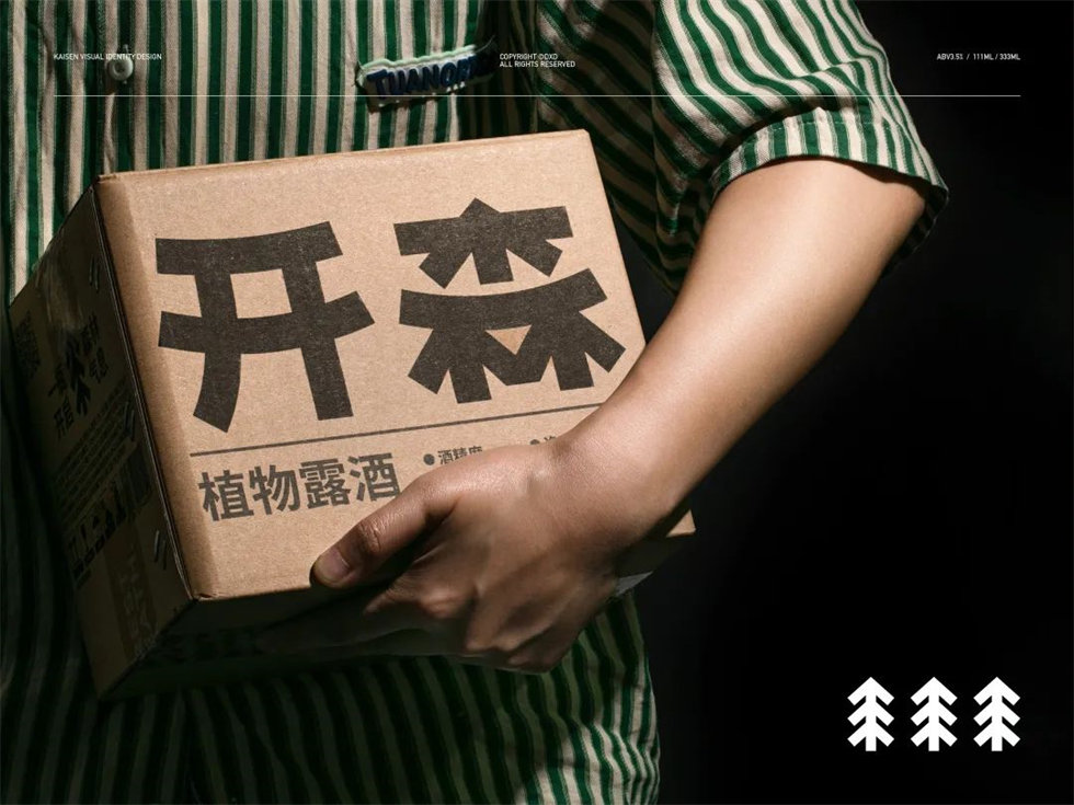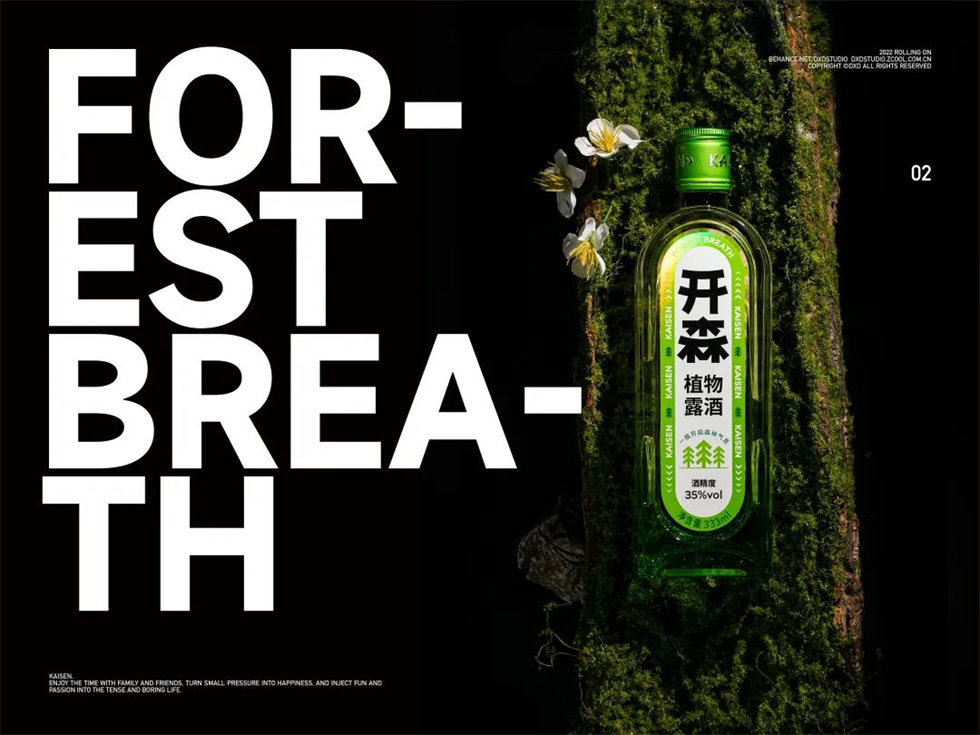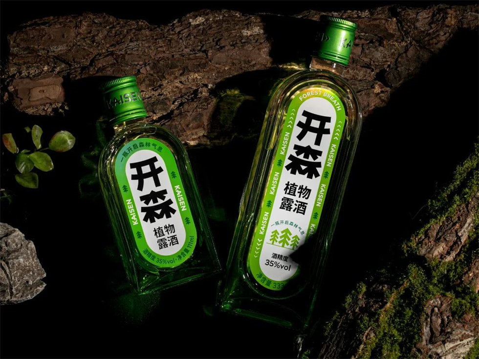 開森®植物露酒包裝設計由“開心”的暗喻延伸到“森林”概念,品牌以“一口開啟森林氣息”為slogan,致力于為用戶帶來全新、有趣的白酒。