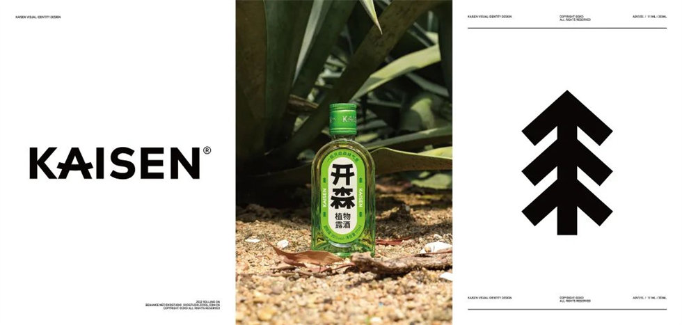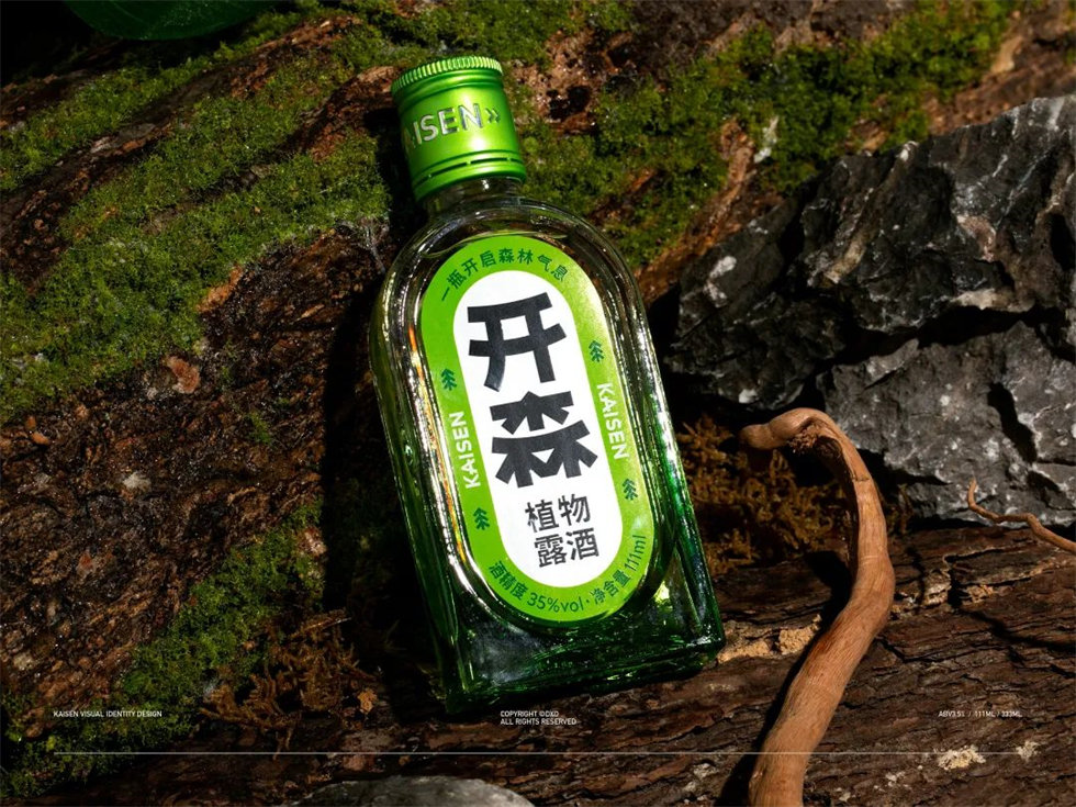 而在白酒瓶身設計上采用獨特的綠色彰顯品牌的森林氣息,與富含草藥精華的酒體互為襯托,從視覺到味覺等感官維度,都讓你“開森”。