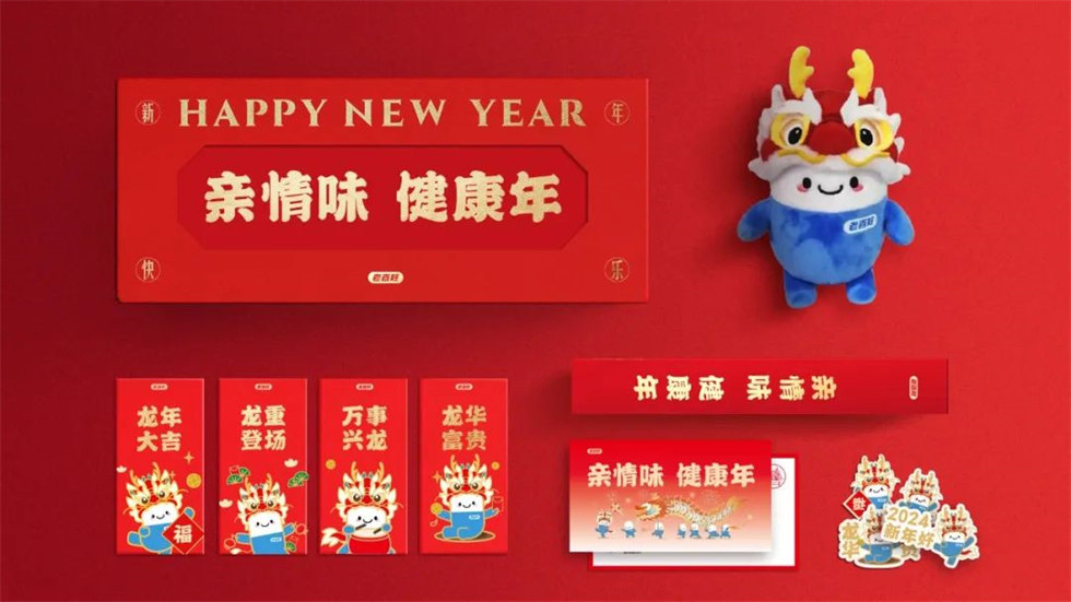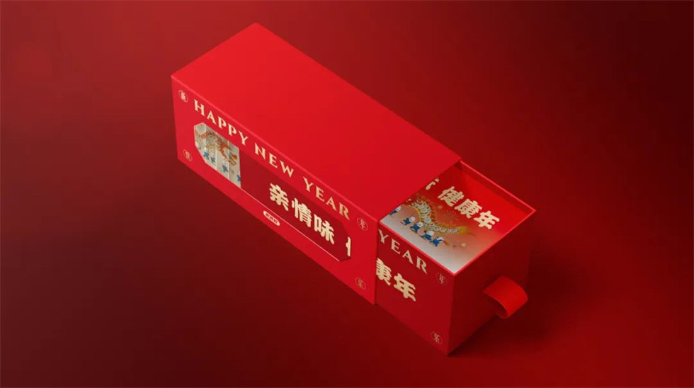 老百姓大藥房2024年新年禮盒包裝設(shè)計(jì)以“親情味,健康年”為主題,采用抽拉式禮盒結(jié)構(gòu)設(shè)計(jì)。打開(kāi)新年禮盒,左側(cè)的“舞龍折頁(yè)”緩緩拉開(kāi),開(kāi)啟龍年新氣象。