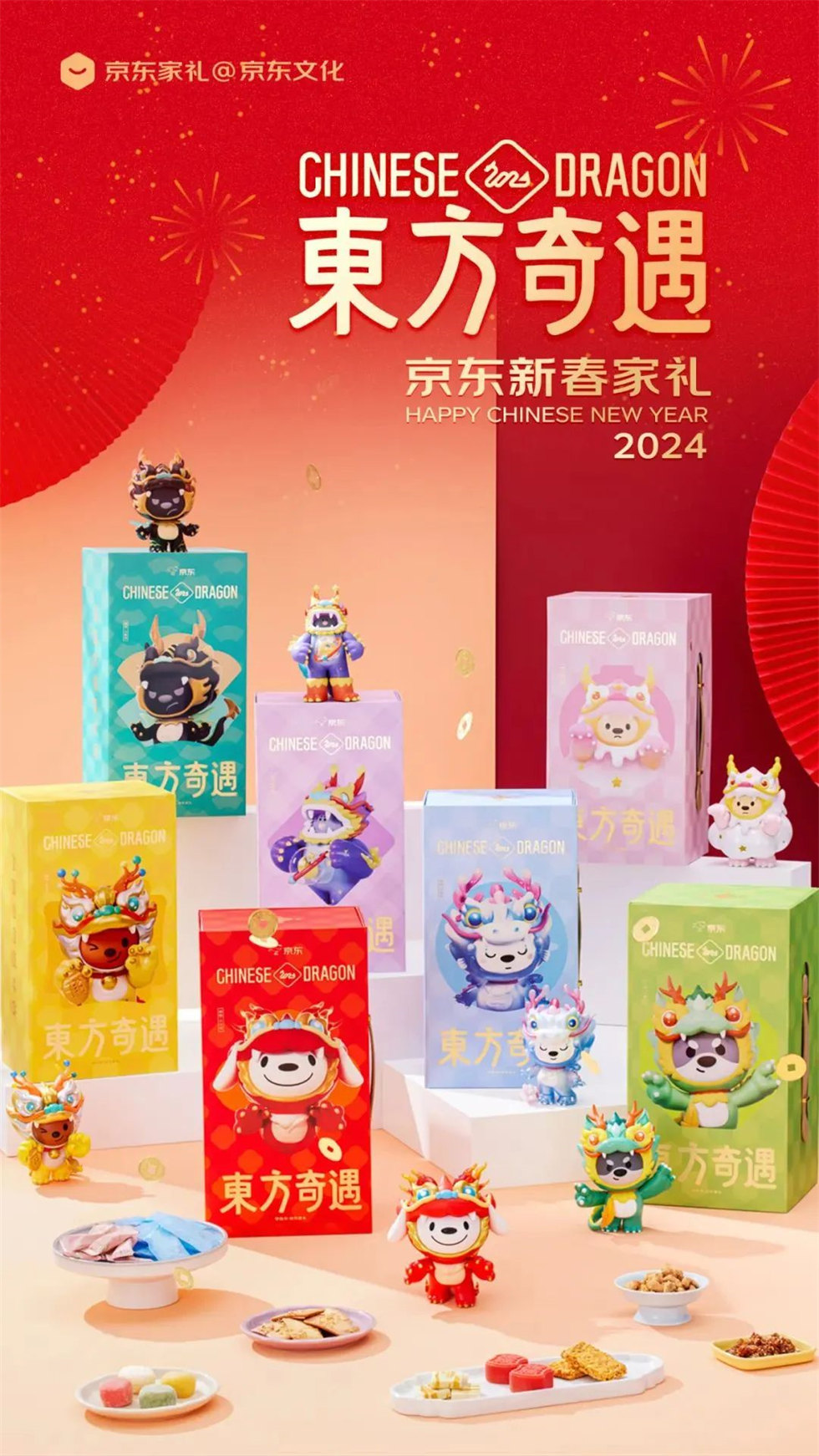 2024京東家禮“東方奇遇”禮盒包裝設計,延續了以往對傳統文化的弘揚,京東將《山海經》中對神龍瑰麗的向往,化為DOGA家族的好運戎裝。龍年春節限定手辦,16cm高加大身體,幸運加倍,福氣加倍。京東家禮禮盒內多款美味,與家人同享。