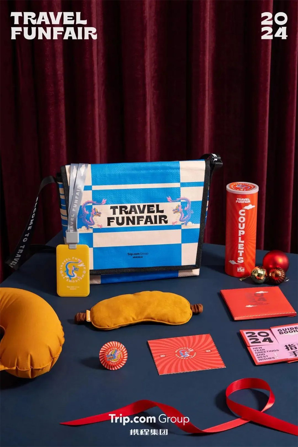 「龍年游園會」禮盒包裝設計內含:旅行寶藏箱、RICH手機支架、頸枕眼罩旅行套裝、香氛花瓶、煙花風車、祝福紅包、新春對聯福字。