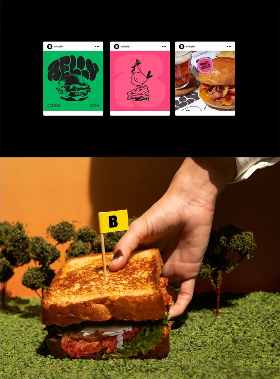 Mr. Belly用美味的三明治和漢堡來滿足你的渴望,把你的肚子放在第一位。受老派節日和音樂的啟發,Mr. Belly創作了一個有趣且多才多藝的三明治和漢堡品牌包裝設計,色彩鮮艷。