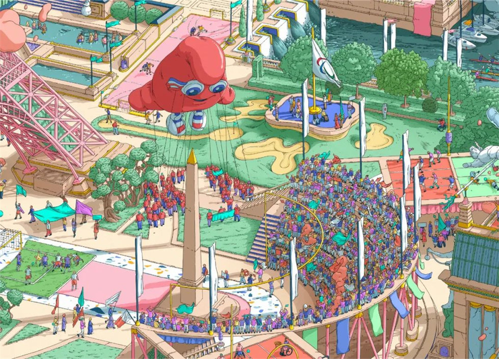畫面描繪了一個面向世界開放的城市,在這個城市中,熟悉的地方、著名景點和標志性建筑被重新排列和重新詮釋。在這個幻想版的巴黎中,體育無處不在。插畫師的藝術處理在過去和現在之間架起了橋梁,連接了1900年奧運會、1924年奧運會以及100年后的2024年奧運會的巴黎。