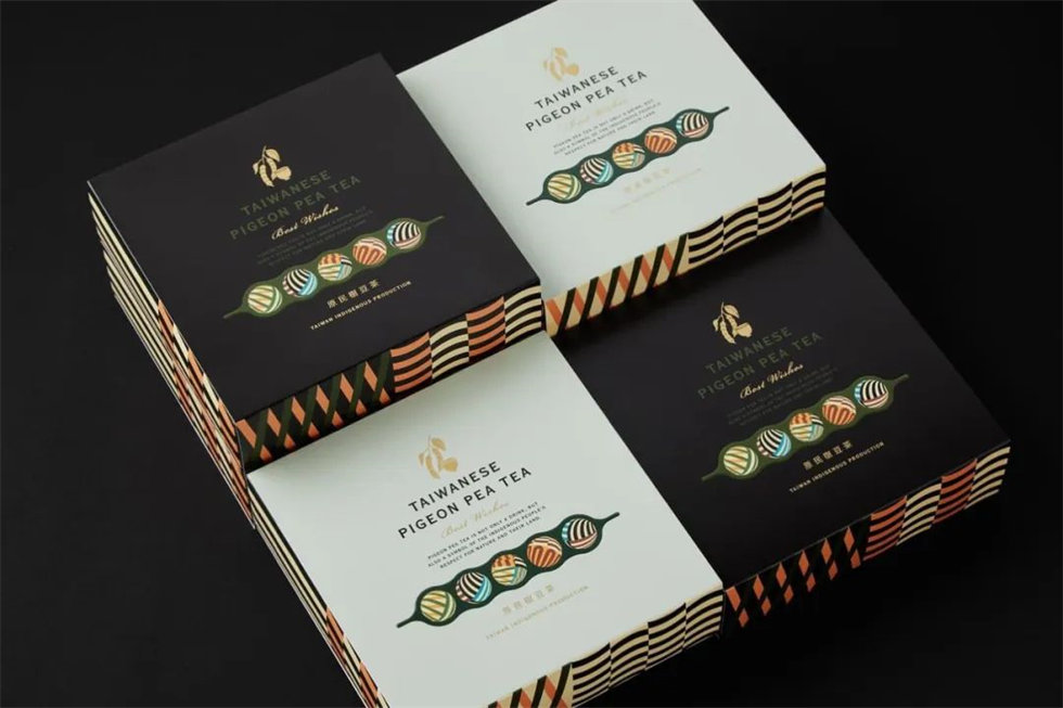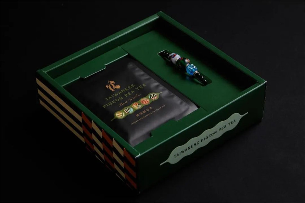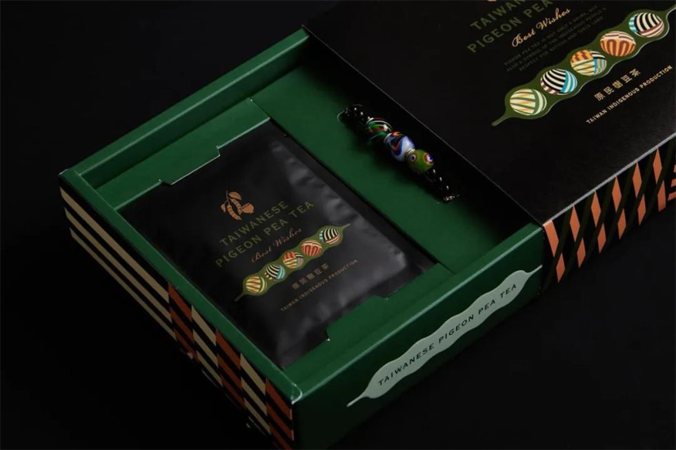 樹豆茶禮盒的包裝設計理念源于排灣族文化,將其古老的智慧與現代生活融合,呈現出獨特的禮品魅力。禮盒內含樹豆茶包與琉璃珠,象征著對豐收與幸福的祝福。