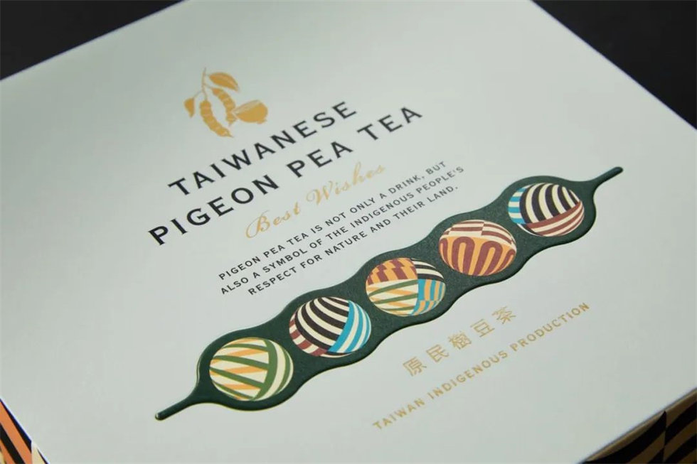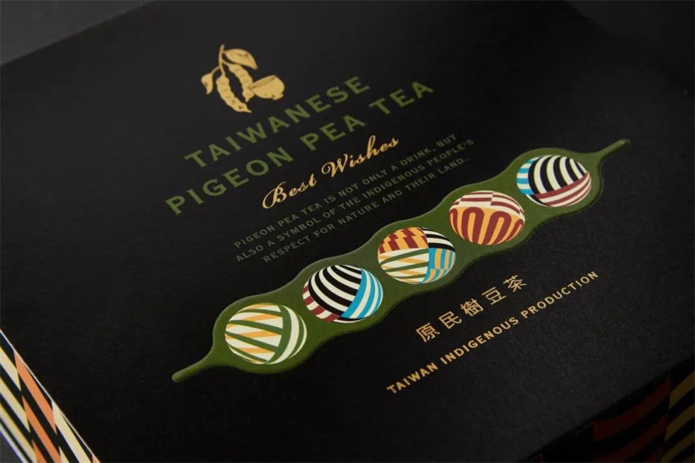 在樹豆茶禮盒包裝設計上,以樹豆的豆莢圖樣為靈感,結合了琉璃珠古語qada所代表的美麗果實,以及號稱后山寶石的樹豆的意象,呈現出一種原鄉之美與自然的豐盈。琉璃珠則象征著排灣族文化中珍貴的獻禮,為禮盒增添了獨特的價值與魅力。