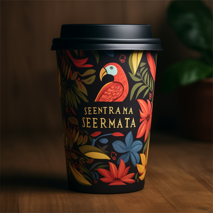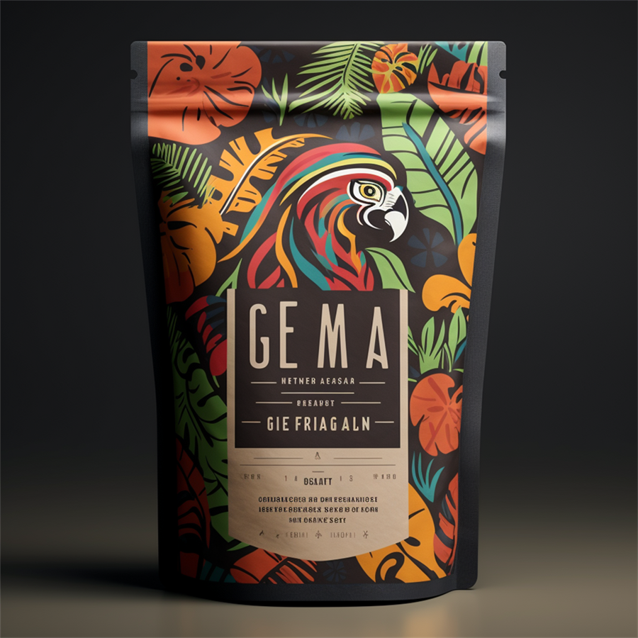 魔法口令:Create a tropical coffee package design named sementedaterra include natural earthbranding colors and a unique logo using a parrot