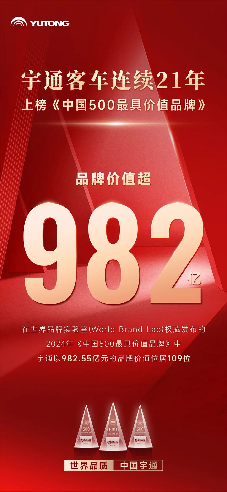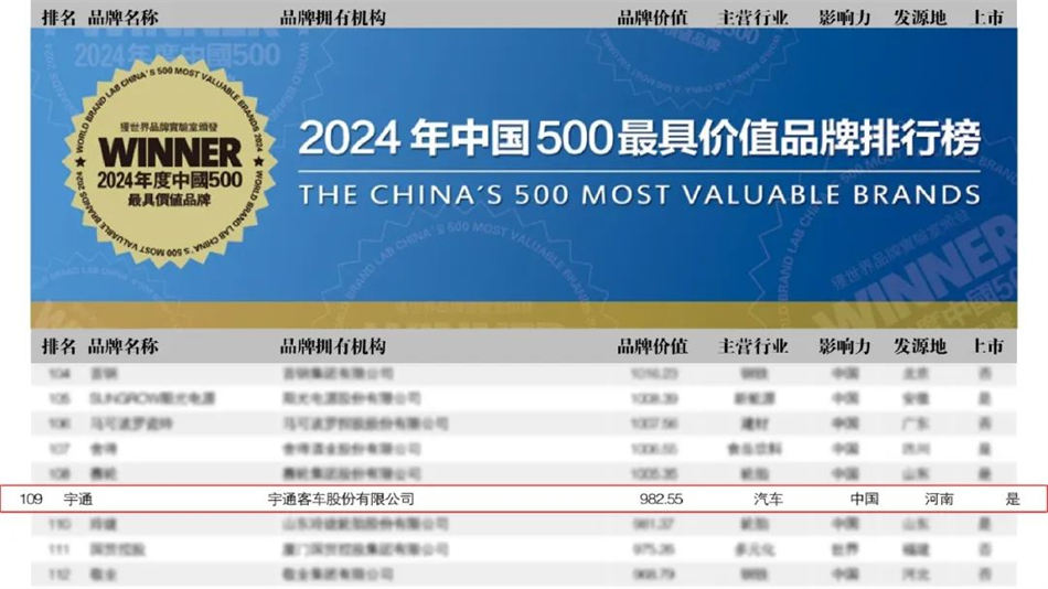 本次宇通客車以982.55億元的品牌價值榮耀位列109位,整體價值較去年躍升153.48億,這不僅是全球專業評審專家對宇通品牌的充分肯定與認可,更表明了宇通的行業領導力和全球品牌影響力的持續提升。