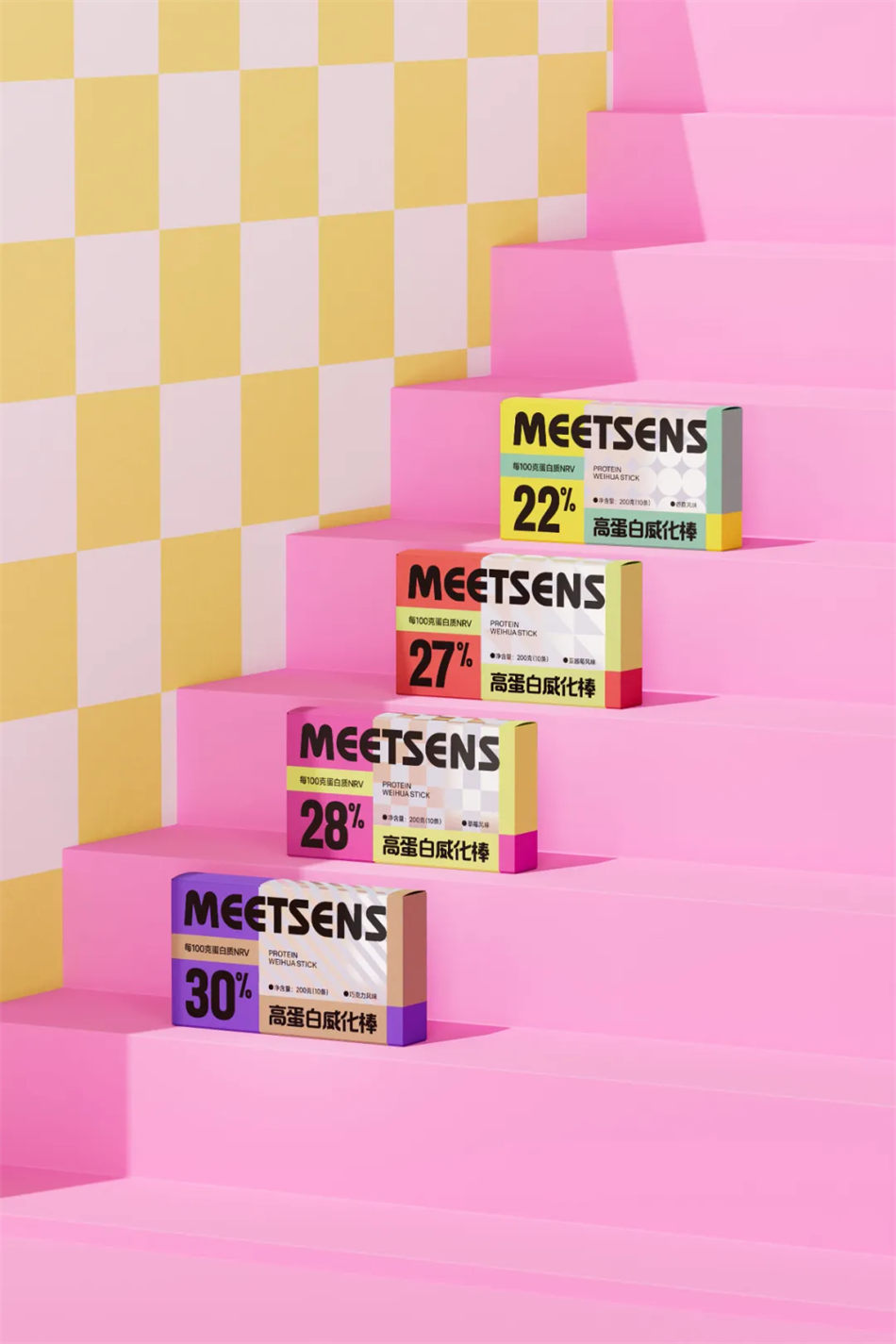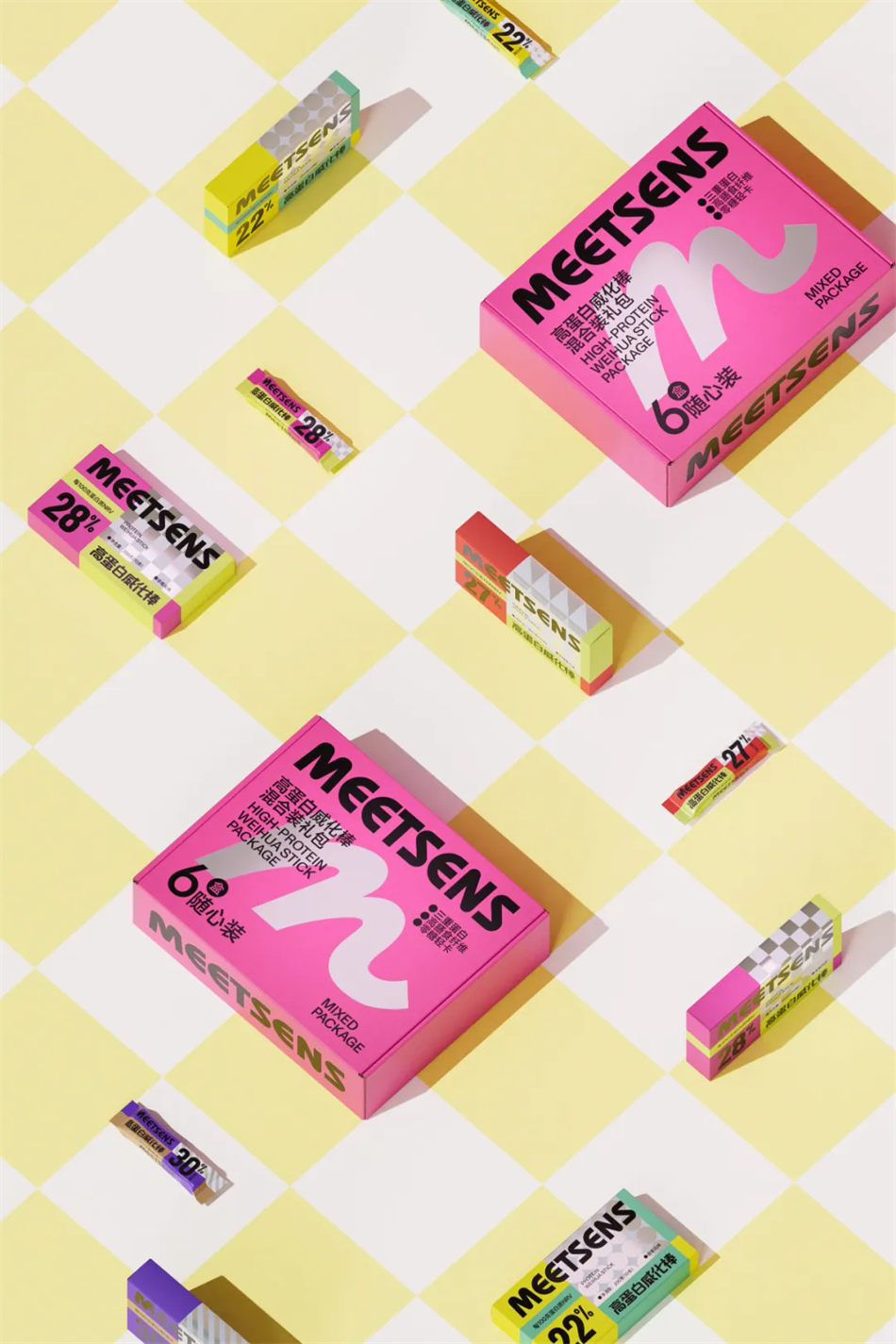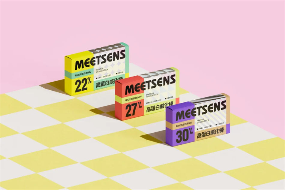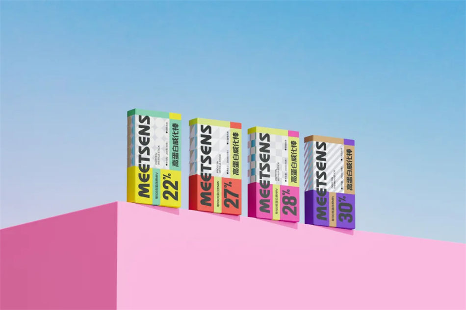 NDL在對Meetsens膳食品牌設計的過程中,充分考慮年輕消費者的審美偏好和購買習慣,運用色彩與幾何紋理的拼接手法,將文字信息合理模塊化,使得膳食品牌包裝既美觀又易于閱讀。同時,放大了蛋白質含量這一關鍵信息,以吸引那些注重健康飲食的消費者,營造出美味健康讓人心情愉悅的視覺感受圖片。